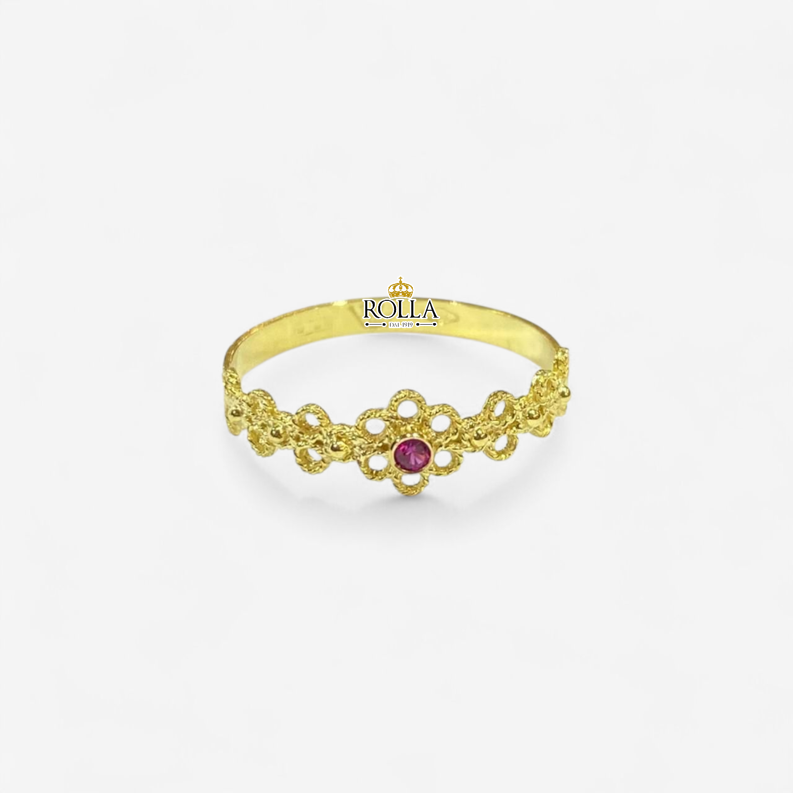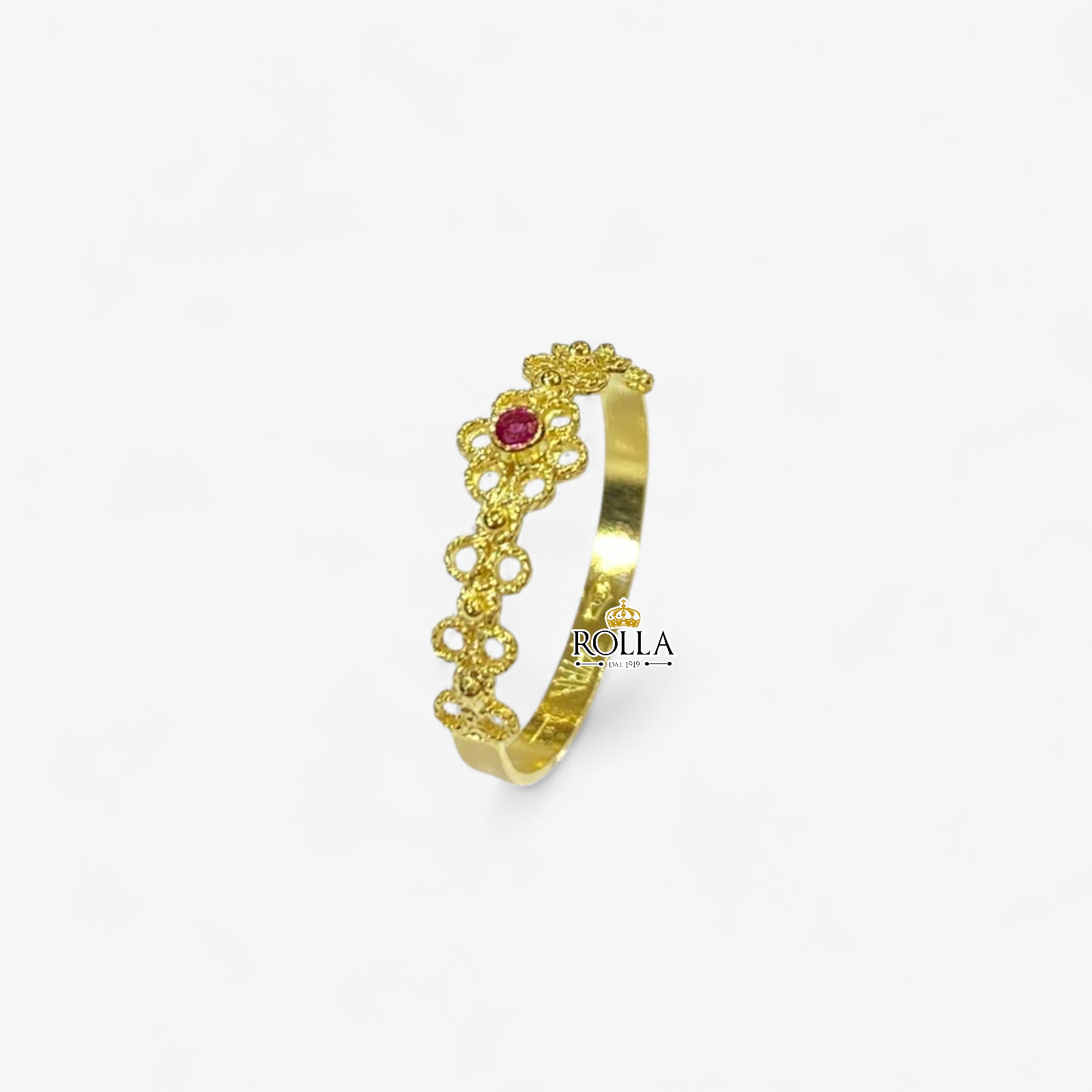Home Filigrana sarda Filigrana Oro Anello fede traforata con strass rosso